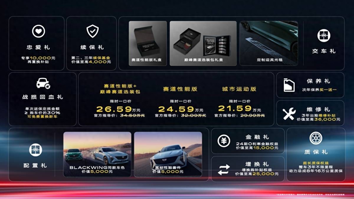 2025年3月1日,凯迪拉克全新CT5崇拜上市,新车同推出三个版块车型,均推出限时一口价战略,其中城市通顺版21.59万元,赛说念性能版24.59万元,赛说念性能版+巅峰赛说念选装包26.59万。跟着新车上市,厂家还推出多重购车礼遇,进一步裁减拥车费本。