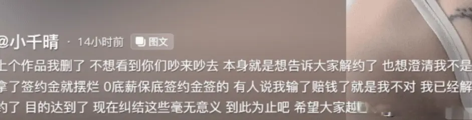 跟着公论握续发酵,小千晴删除了当先的那条爆料视频,并再次发声,称我方当先仅仅想澄澈事实,不但愿外界误以为我方拿了签约金后摆烂,她强调我方是“零底薪、零签约金”签下的条约,如今终于顺利解约,宗旨依然达到,莫得必要再纠缠,说话中也流知道一种但愿平息风云的无奈。