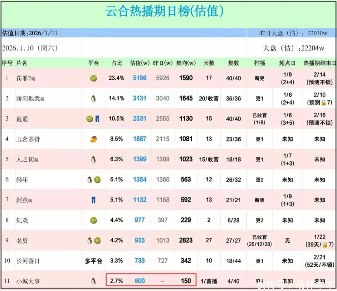 在网播收成方面,《小城大事》全网播放量首日占比为2.7%,播放量估值600万,集均播放量150万,平台播放热度23191,开局不利。