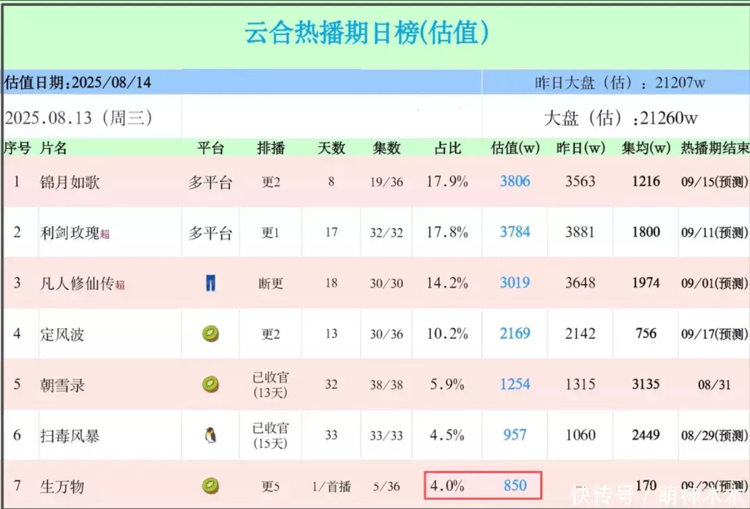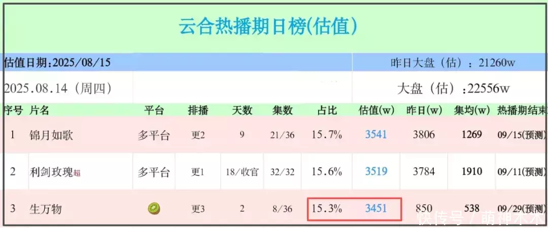 网播收成方面,《生万物》开局也不睬思,大盘播放量占比为4%,播放量估值850万。关联词,上线次日,口碑发酵,大盘播放量占比猛增,达到了15.3%,播放量估值3451万,是前一天的四倍,低开高走。