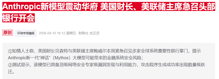 财联社报说念提到,本周二,好意思国财长贝森特和好意思联储主席鲍威尔垂死召集了各大银行的CEO。有音问称,监管层警告银行们厚爱对待Mythos模子,并运用其才能识别系统随意。